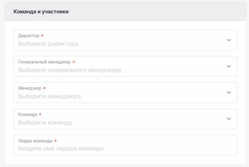 Затем вам нужно ввести имя лидера команды в соответствующее поле. Поля в разделе «Команда и участники» являются обязательными и должны быть заполнены всегда.