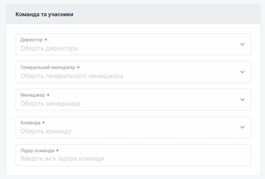 У розділі «Команда та учасники» вам потрібно вибрати необхідні теги для кожної категорії: «Директор», «Генеральний менеджер», «Менеджер», «Команда».